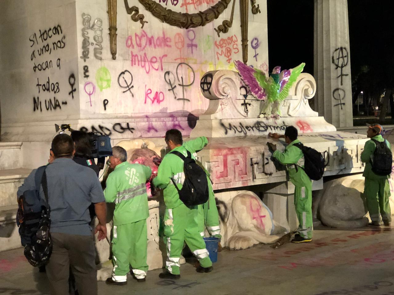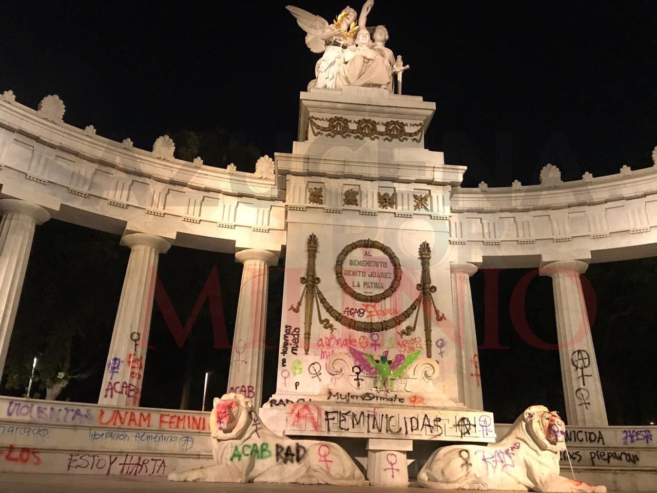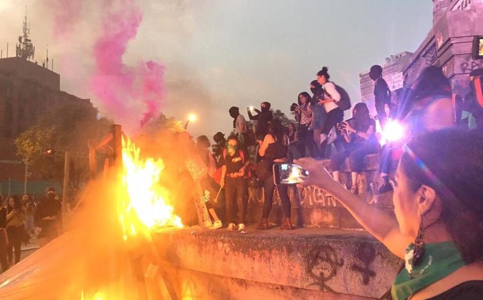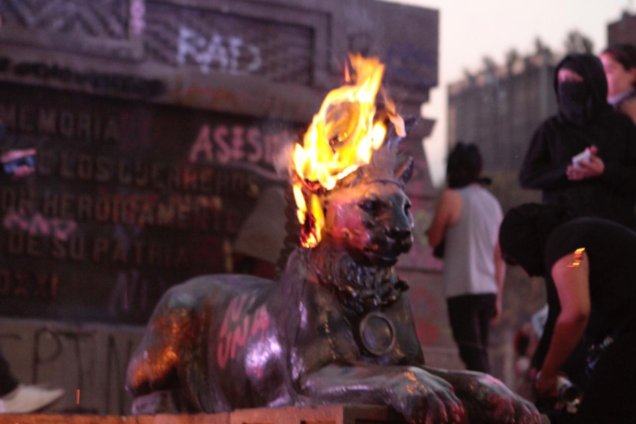 Las activistas llegaron al Monumento a Cuauhtémoc, el que también fue vandalizado. Mujeres encapuchadas quitaron las protecciones metálicas que lo cubrían y al lograrlo, subieron las escalinatas con los brazos en alto en señal de triunfo, y fue entonces cuando lo dañaron con pintas. Eso no les pareció suficiente y le prendieron fuego.