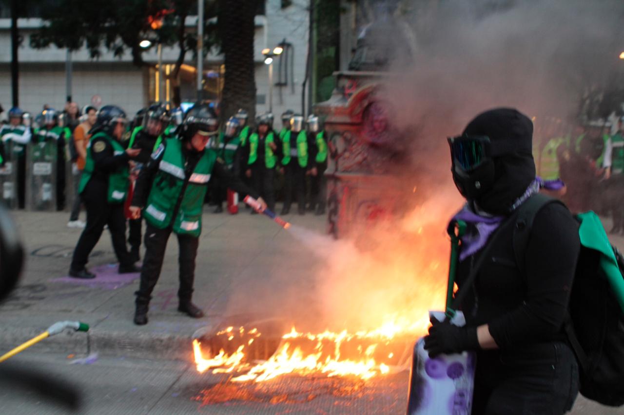 Llegaron a Bellas Artes y la situación no fue diferente, ahí también se arrancaron las protecciones y se prendió fuego en diversos puntos. Detrás de las manifestantes, la policía llegaba con extintores para apagar los incendios.