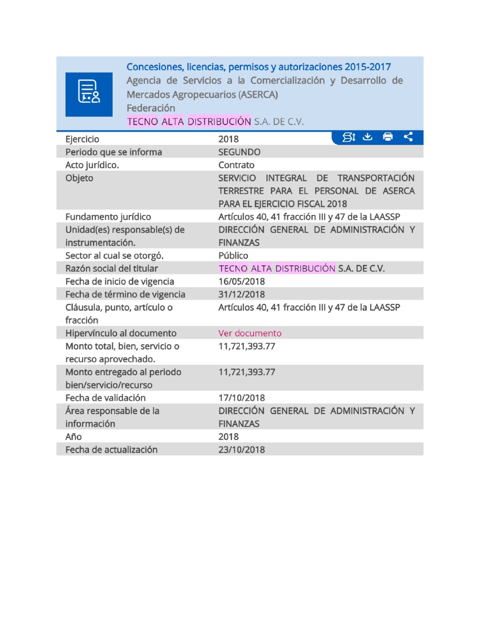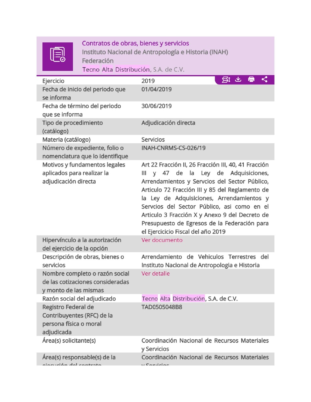 Tecno Alta Distribución recibió en los pasados años contratos de dependencias gubernamentales por unos mil millones de pesos, vía la prestación del servicio de arrendamiento y alquiler de vehículos. De acuerdo con la Plataforma Nacional de Transparencia, el IMSS le dio en febrero de 2016 un contrato inicial de $54 916 481.62, pero en el transcurso de ese mismo, se modificó y recibió $25,008,483.50 más, es decir 80 millones de pesos con adjudicación directa.