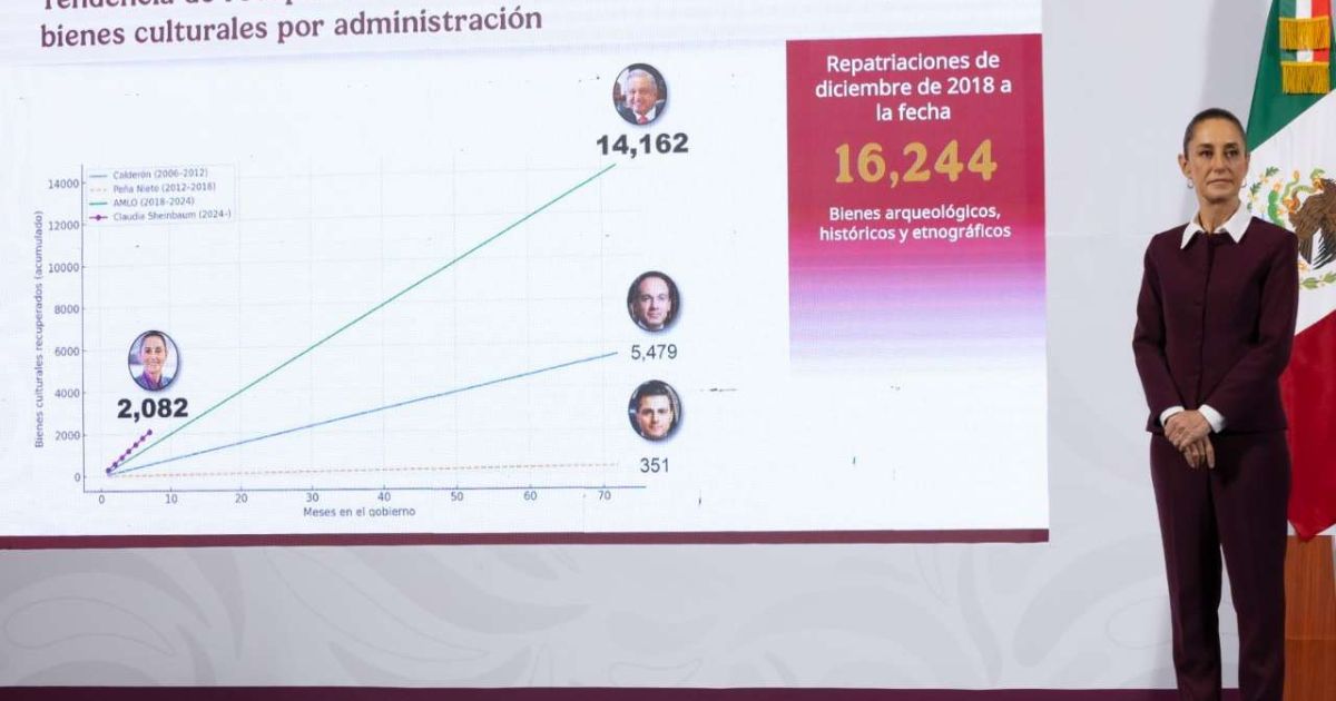 Bajo el mandato de Andrés Manuel López Obrador se lograron repatriar 14 mil 162 bienes; con Peña Nieto fueron solo 351; con Calderón, 5 mil 479, y en los primeros siete meses del gobierno de Claudia Sheinbaum ya se contabilizan 2 mil 82 objetos recuperados.