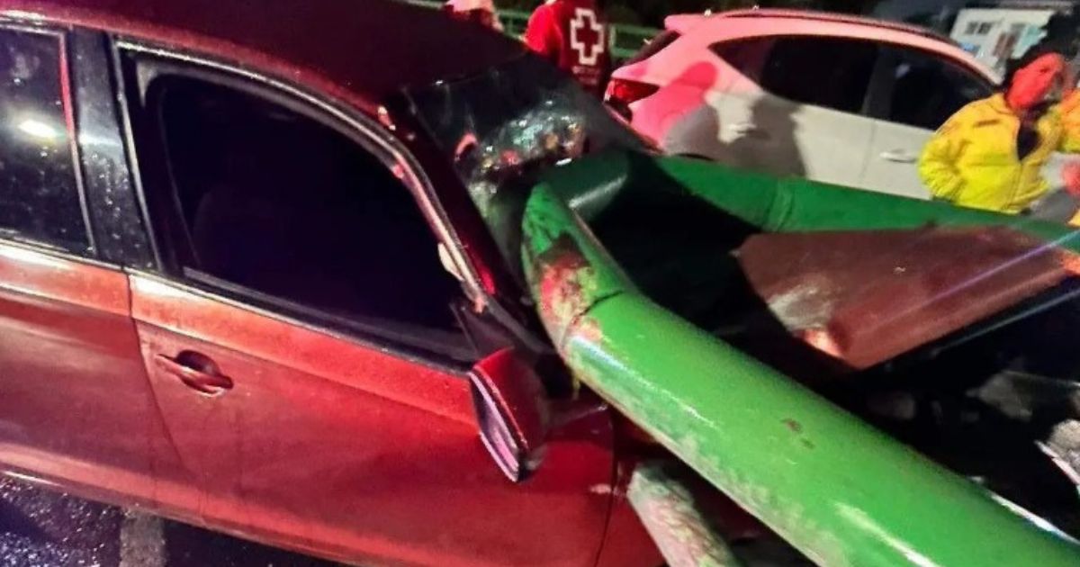El automóvil rojo quedó contra el muro de contención del puente, con el frente totalmente destrozado.
