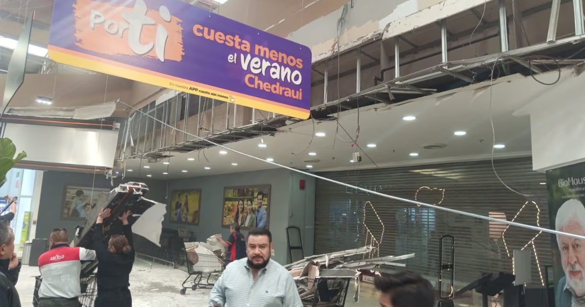 Los hechos ocurrieron la tarde de ayer en la tienda Chedraui Selecto, ubicada en avenida Universidad y San Lorenzo, colonia Santa Cruz Atoyac, donde, debido a las fuertes lluvias y rachas de viento, se desplomó parte de la estructura y cayó cerca de la zona de cajas.