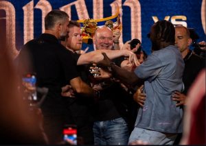 En pleno cara a cara, Crawford se lanzó al frente y Canelo lo empujó sin pensarlo dos veces. Tensión máxima. Dana White tuvo que intervenir para evitar que la conferencia terminara a puñetazos. El campeón mexicano, con mirada de acero, pidió un ring más pequeño: quiere guerra, no maratón. Crawford respondió con burla: “El único correr que haré será alrededor de su cabeza… y esa cabeza es grande”.