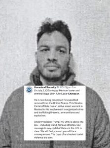 Luego que Julio César Chávez Jr. fue detenido por agentes del Servicio de Inmigración y Control de Aduanas de Estados Unidos (ICE) en su casa de Studio City, California, por su ilegal residencia en el territorio vecino, los gringos lo acusaron de ser uno de Los Chapitos y representar una amenaza para su país. Cosa que confirmó más tarde la Fiscalía General de la República (FGR) tras que EU reveló una orden de aprehensión desde hace dos años por vinculaciones al crimen organizado con el deportista en México.