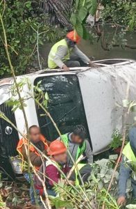 Al llegar, observaron la unidad color blanco, la cual se encontraba aproximadamente a 20 metros de profundidad y en la que viajaban 18 trabajadores de la construcción, por lo que solicitaron los servicios de emergencia.