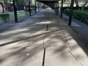 Las calles y el estacionamiento que lo rodean muestran distintas deformaciones y pandeos.