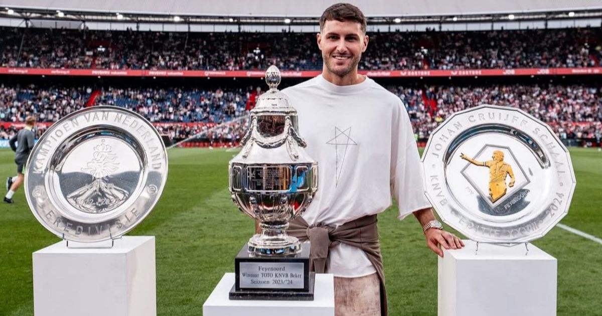 Santi Gimenez posó frente a las cámaras con la bandera de México, mientras que la directiva del Feyenoord sacó los trofeos que el equipo ganó con el mexicano en la cancha: la Eredivisie, la Copa y Supercopa de Países Bajos.