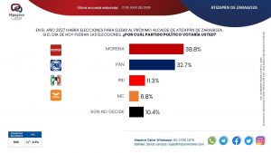 De acuerdo con la firma Massive Caller, Morena es el partido con el que más simpatizan los ciudadanos de Atizapán de Zaragoza recientemente encuestados por la compañía, con un 38.8 por ciento de los consultados.