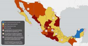 En el nivel 2, figuraron las siguientes entidades: Aguascalientes, Baja California Sur, Durango, Hidalgo, Ciudad de México, Estado de México, Nayarit, Nuevo León, Oaxaca, Puebla, Querétaro, Quintana Roo, San Luis Potosí, Tabasco, Tlaxcala y Veracruz. Posterior a ello, en el nivel 1 —con advertencia mínima o normal—, se ubicaron los estados de Campeche y Yucatán.