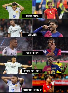 En LaLiga, el Barcelona goleó al Real Madrid 4-0 en octubre de 2024, con un gol y una asistencia de Yamal. En la final de la Supercopa de España en enero de 2025, el cuadro culé venció 5-2, con ambos futbolistas marcando en la portería enemiga. La final de la Copa del Rey en abril de 2025 también fue para el Barcelona (3-2 en la prórroga), con Yamal asistiendo un gol y Mbappé anotando para el Madrid.