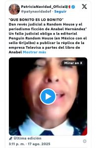 CDMX. La actriz mexicana Paty Navidad, se encuentra feliz, celebra resolución judicial, en contra de algunos fragmentos de “Las señoras del narco” de Anabel Hernández: e indica “esto apenas comienza”. Navidad reaccionó a la orden judicial en contra de Penguin Random House, por la publicación de “Las señoras del narco: amar en el infierno” que lanzó Anabel Hernández en 2023 en donde indican que se prostituyó con el narcotraficante Arturo Beltrán Leyva.