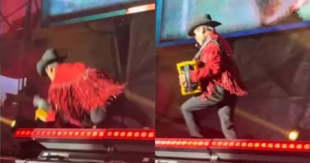 Sin embargo, lo que debía ser un concierto de fiesta terminó generando preocupación cuando el también acordeonista de los llamados “Jefes de jefes”, caminó sobre el escenario, luciendo una chamarra roja y un sombrero negro, cuando tropieza con una parte de la estructura y termina en el suelo.