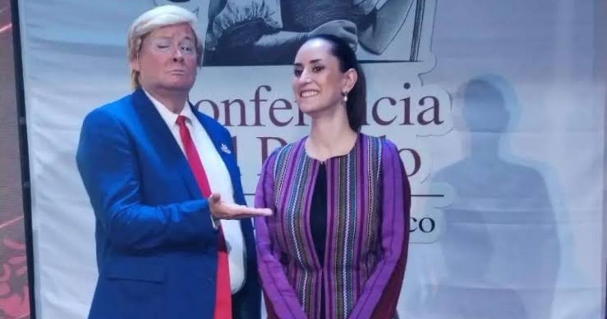 En el escenario, una réplica del templete del Salón de la Tesorería de Palacio Nacional, donde la presidenta Sheinbaum ofrece sus conferencias matutinas, “Trump” lanzó frases como: “Me encanta el deporte, sí… mañana voy a deportar a 500 cabrones”