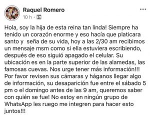 De acuerdo con testimonios, Marciala había hecho una llamada alrededor de las dos de la madrugada del domingo, mencionando que se encontraba en las cuevas. Desde entonces se perdió todo rastro de ella.