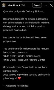 CDMX. El cantante mexicano Alejandro Fernández, preocupo a sus seguidores y despertó las alarmas tras suspender dos conciertos en Estados Unidos luego de recibir un diagnóstico de salmonelosis. Por recomendación médica, el cantante pospuso sus presentaciones en Dallas y El Paso Texas.
