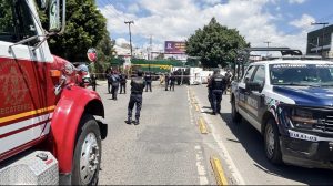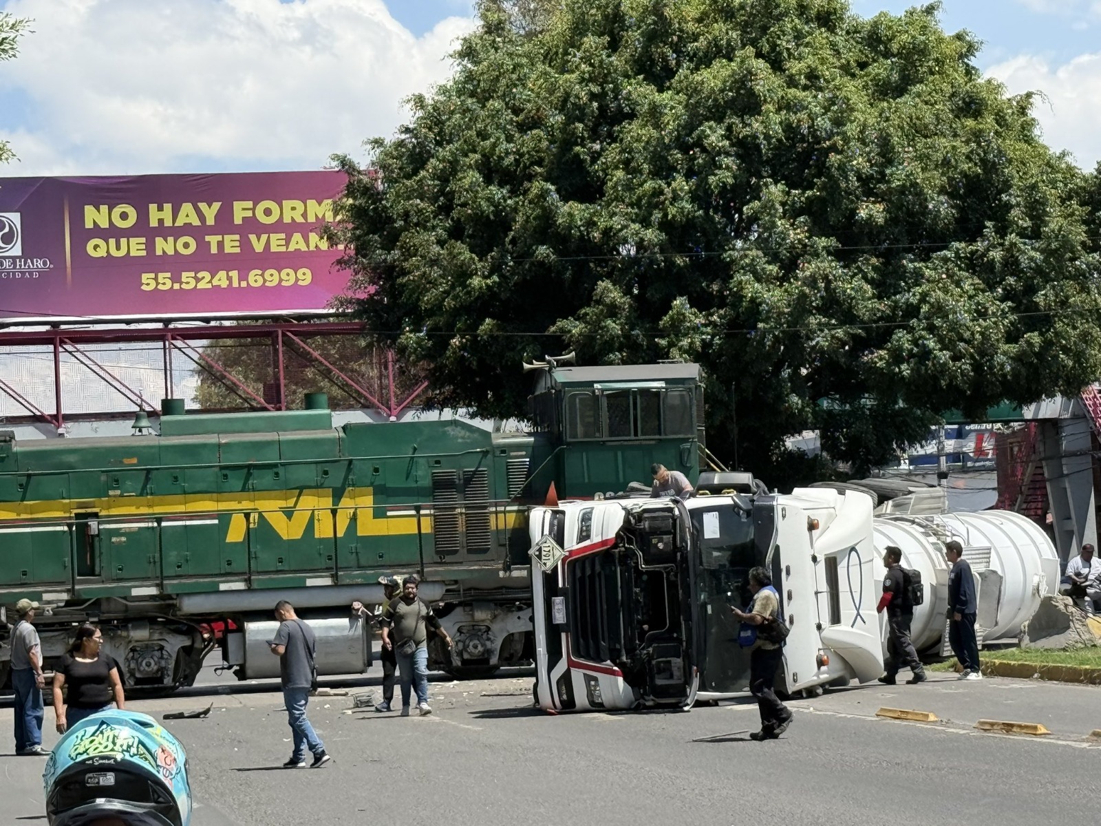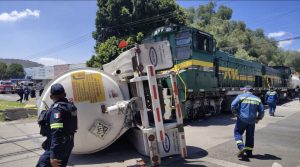 Ecatepec, Méx., a 22 de septiembre de 2025. Tras dos horas y media de trabajos de los cuerpos de emergencia de Ecatepec, fue reabierta la circulación en la Vía Morelos, tras retirarla pipa de la empresa Transportes IESVS que resultó volcada en la Vía Morelos, al intentar ganar el paso al tren y cuyo conductor Rodrigo “N” fue detenido y presentado ante el ministerio público.