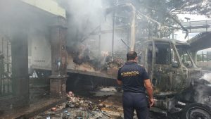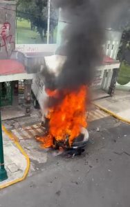 Las llamas consumieron en su totalidad el vehículo, ya que pasó casi media hora antes de que bomberos sofocaran el fuego, ante el temor de ser agredidos por los enardecidos manifestantes.