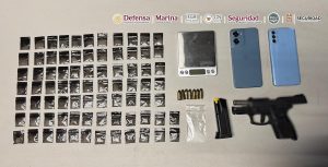 En la revisión del vehículo, los agentes localizaron un arma de fuego con cargador y cartuchos útiles, 79 dosis de presunta metanfetamina tipo cristal, una báscula gramera y dos teléfonos celulares. Todo fue asegurado y puesto a disposición de la autoridad ministerial.