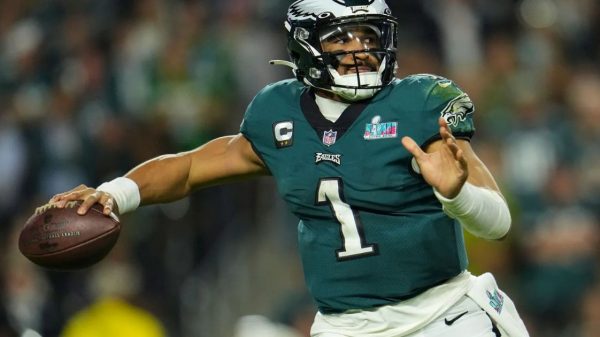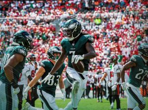 Jalen Hurts lanzó dos pases de touchdown, Sydney Brown devolvió un despeje bloqueado para anotar y los Eagles vencieron a los Tampa Bay Buccaneers para su vigésima victoria en 21 juegos. La única derrota en ese período para los campeones reinantes del Super Bowl fue contra los Washington Commanders en diciembre pasado en un juego que Hurts dejó con una conmoción cerebral en la primera mitad.
