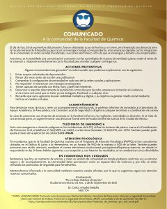 Entre los planteles que ante las amenazas hechas por redes sociales, tomaron la medida preventiva a partir del 29 de septiembre, están las facultades de Química, Arquitectura, Odontología, Ingeniería, Economía, Derecho, y Psicología. La primera de estas aseguró que interpondría una denuncia penal ante la Fiscalía General de la República (FGR).
