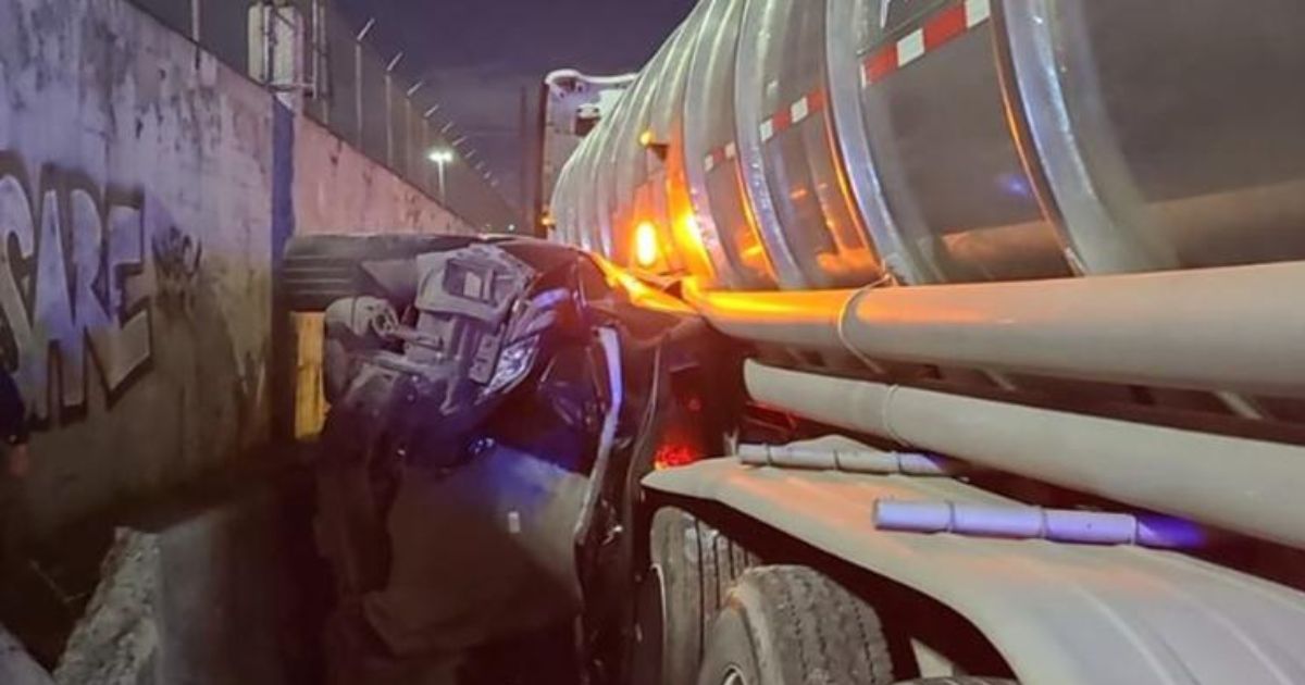 Tras el percance, el auto quedó entre la estructura de concreto y el tanque metálico de la cisterna con capacidad para más de 40 mil litros, y aunque quedó completamente desechó, los tripulantes lograron salir caminando de su unidad para ponerse a salvo.
