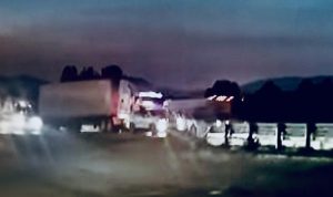 En las imágenes, difundidas ampliamente en redes sociales, se observa cómo dos vehículos, uno compacto y una camioneta acorralan al tráiler mientras varios sujetos armados, disparan desde las ventanillas.