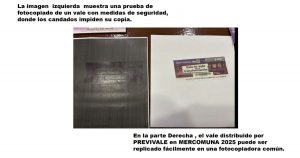 De acuerdo con análisis técnicos y reportes difundidos en medios de comunicación, la empresa Previsión del Trabajo S.A. de C.V. (PREVIVALE) —actual responsable de la operación del programa MERCOMUNA 2025— habría impreso y puesto en circulación vales que no cumplen con los estándares de seguridad establecidos en la licitación pública LPN-SAPCI-001-2025. Esta situación ha derivado en que copias y reproducciones no autorizadas comiencen a detectarse en varios puntos de la capital, cuestionando la confiabilidad del papel y del esquema de control utilizado.