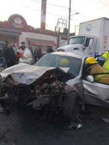 La imprudencia del conductor de un auto compacto provocó un fuerte accidente, luego que intentara incorporarse a la carretera Panamericana de la colonia La Palma con dirección al municipio de Acambay y fuera embestido por un tráiler, que no pudo frenar, por lo que terminó impactándolo.