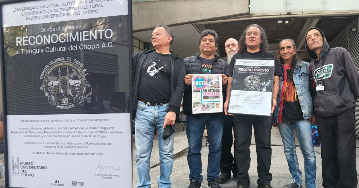 Ahora ante el festejo de aniversario de ambos entes de cultura, el Museo universitario del Chopo, convoco a “El Chopo en El Chopo”, para realizar las actividades que realizaron en sus inicios; y en el marco de su encuentro, aprovecharon para entregarles una distinción a los más de 200 choperos: “Otorga el presente reconocimiento, al Tianguis Cultural de Chopo A.C, por sus aportes a la cultura de la música, el trueque y la autogestión. Nos enorgullece ser parte de su historia y rememorar el Primer Tianguis de publicaciones musicales y discos, llevado a cabo el 4 de octubre de 1980 en nuestras instalaciones y el cual dió origen al Tianguis Cultural del chopo. Celebramos su 45 aniversario y su estatus como Patrimonio Cultural Inmaterial de la CDMX”, mismo que fue entregado al comité de cultura, encabezado por Cesar Salas