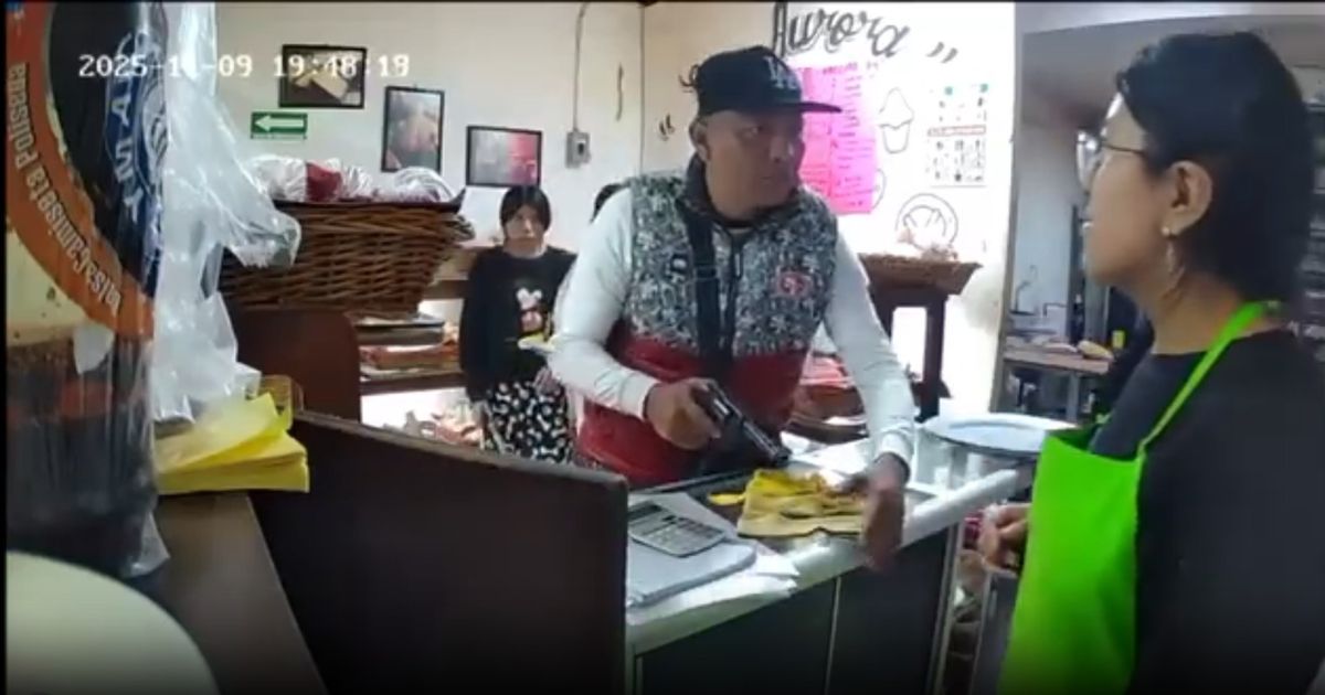 En la videograbación se ve como el ladrón hace fila atrás de un señor que compra algunas piezas de pan y al lado de una mujer, sin embargo, al llegar al mostrador, saca de una bolsa que lleva colgada, conocida como mariconera, una pistola tipo revólver con la que amaga a la trabajadora.