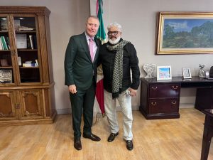 Durante el encuentro, el embajador se mostró complacido de recibir a Zamudio, quien cuenta con más de 50 años de trayectoria como compositor, arreglista, productor y cantante, y cuyo legado en el regional mexicano incluye la creación del popular movimiento de “Baile del Caballito”.