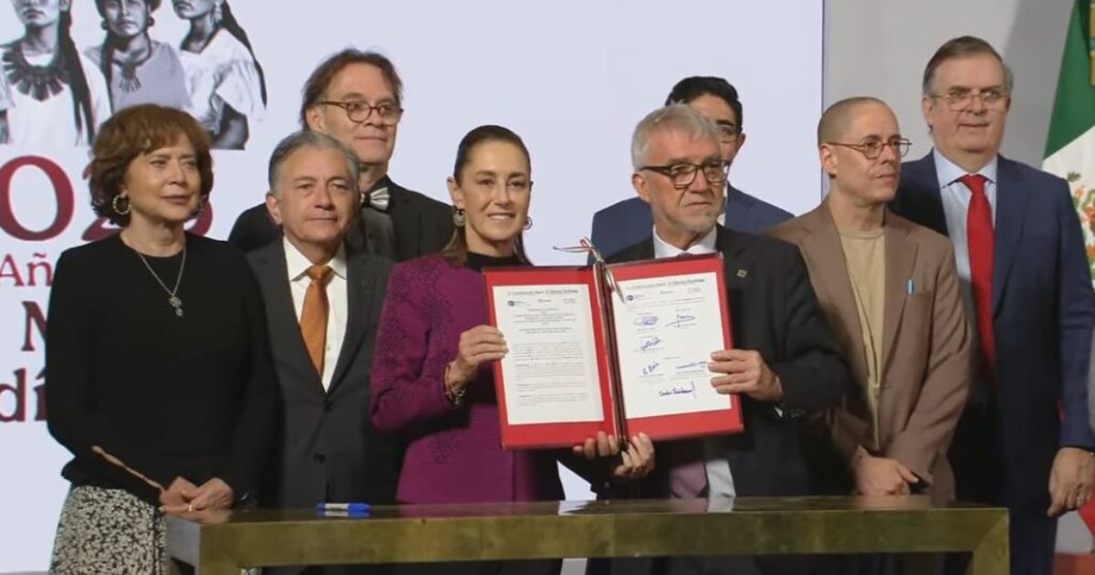 Tras la exposición del proyecto en puerta, la presidenta Sheinbaum Pardo, Rosaura Ruiz, José Merino y Mateo Valero, firmaron el convenio.