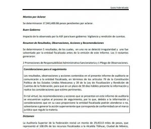 En ambos casos, la ASF ante las faltas graves del control presupuestal, solicitó a la alcaldía que se impongan sanciones a los funcionarios públicos responsables de la ejecución de los recursos en los casos señalados.