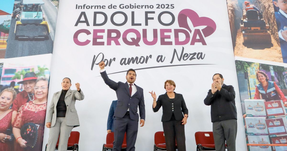 El Presidente Municipal de Nezahualcóyotl, Adolfo Cerqueda Rebollo, rindió su Informe de Gobierno 2025, en compañía de la Gobernadora del Estado de México, Delfina Gómez Álvarez, a quien agradeció su respaldo y el de la Presidenta Claudia Sheinbaum Pardo, para impulsar el Plan Integral de la Zona Oriente del Estado de México para traer desarrollo, seguridad y bienestar para las y los nezatlenses.