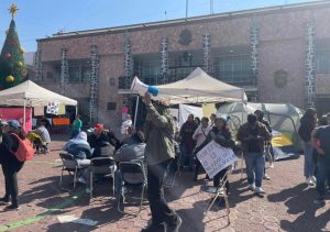 En la explanada municipal, casas de campaña, mantas y carteles cubren ya parte de la fachada. Las consignas son directas y cargadas de reproche: “Rosi, traicionaste al pueblo de Tecámac”, “Quienes solo persiguen intereses personales jamás entenderán una lucha colectiva”, se lee entre la decoración navideña del edificio público.
