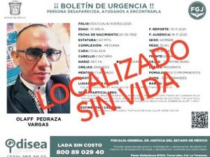 El cuerpo del profesor de primaria Olaff Pedraza Vargas, quien fuera reportado como desaparecido en Nextlalpan, fue localizado sin vida flotando en el canal de aguas negras donde también se descubrió el cadáver del sacerdote Ernesto Vilchis, tras ser visto por última vez el pasado 18 de noviembre de 2025.