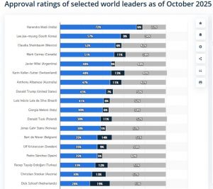 Statista ofrece otro ángulo: coloca a Sheinbaum en el lugar 3 global, con 52% de aprobación, solo detrás de Modi (72%) y del líder surcoreano Lee Jae-myung (57%). En este listado de 24 líderes, solo tres latinoamericanos aparecen en posiciones destacadas: Sheinbaum, Javier Milei (48%) y Luiz Inácio Lula da Silva.