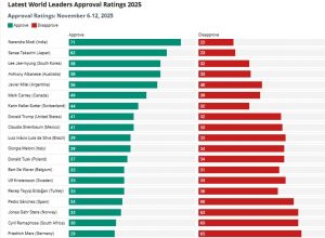 El contraste con otros mandatarios es evidente. En el mismo ranking de Morning Consult, el presidente estadounidense Donald Trump ronda el 44% de aprobación, reflejo de la polarización interna