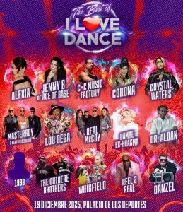 Lo que comenzó como una serie de discos que recopilaron los himnos más bailados de los 90 y 2000, se transformó en un en vivo: I Love Dance en concierto. Desde sus primeras ediciones, el proyecto conquistó al público con shows sold out en recintos como el Pepsi Center WTC, reuniendo a miles de fans que volvieron a cantar y bailar con sus ídolos después de más de dos décadas. Ahora crece con concierto en el Palacio de los Deportes, 19 de diciembre, donde se esperan más de 16 mil asistentes.