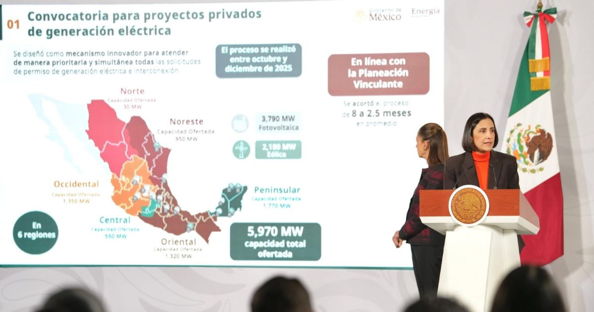 Por su parte, la secretaria de Energía, Luz Elena González, informó que se han diseñado concursos para atender de manera simultánea las solicitudes privadas de generación e interconexión. En total, se contabilizan 20 proyectos de generación y almacenamiento, con una inversión de 4,752 millones de dólares —cerca de 90 mil millones de pesos— en cinco regiones del país. Estas obras, que ya cuentan con terrenos y permisos, se desplegarán en 11 estados y aportarán 3,320 megawatts adicionales.