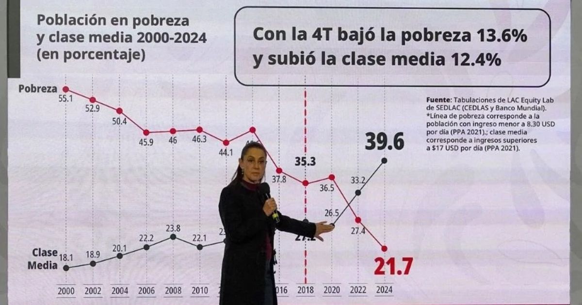 Con gráficas en mano y datos del Banco Mundial, Sheinbaum fue desmenuzando la película completa. Año 2000, inicio del siglo XXI tras tres sexenios neoliberales: 18.1% de clase media frente a 55.1% en pobreza. Casi inmóviles, como una fotografía amarillenta. Con Peña Nieto, el movimiento fue tímido: 27.2% de clase media y 35.3% de pobreza. Pero entonces llegó el quiebre.
