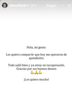 “Hola, mi gente. Les quiero compartir que hoy me operaron de apendicitis. Todo salió bien y ya estoy en recuperación. Gracias por sus buenos deseos. ¡Los quiero mucho!”, se lee en el mensaje revelado por el propio