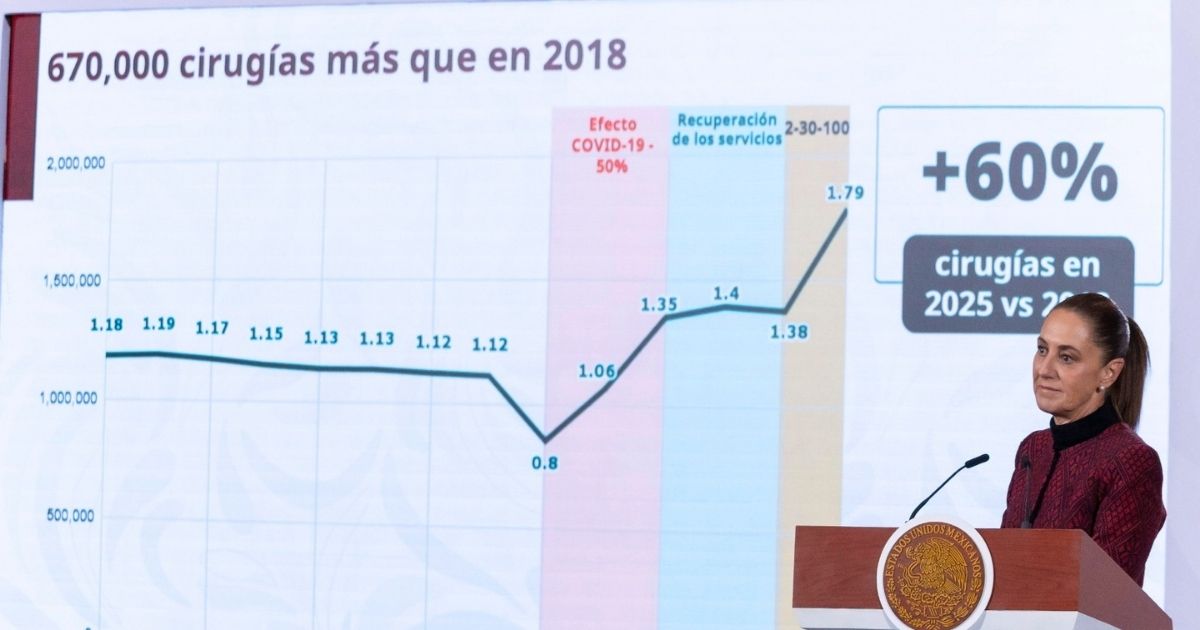Ciudad de México.- Con un incremento del 60% en cirugías realizadas desde 2018, el sistema público de salud cerró 2025 con cifras récord: casi dos millones de procedimientos quirúrgicos, más de 30 millones de consultas de especialidad y más de 100 millones de consultas de medicina familiar, de acuerdo con datos oficiales presentados durante la conferencia matutina en Palacio Nacional.