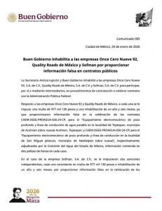 Ciudad de México.- La Secretaría Anticorrupción y Buen Gobierno informó que aplicó sanciones en contra de tres empresas privadas por incurrir en irregularidades durante la celebración de contratos de obra pública, por lo que quedaron inhabilitadas para participar en procedimientos de contratación con la Administración Pública Federal.