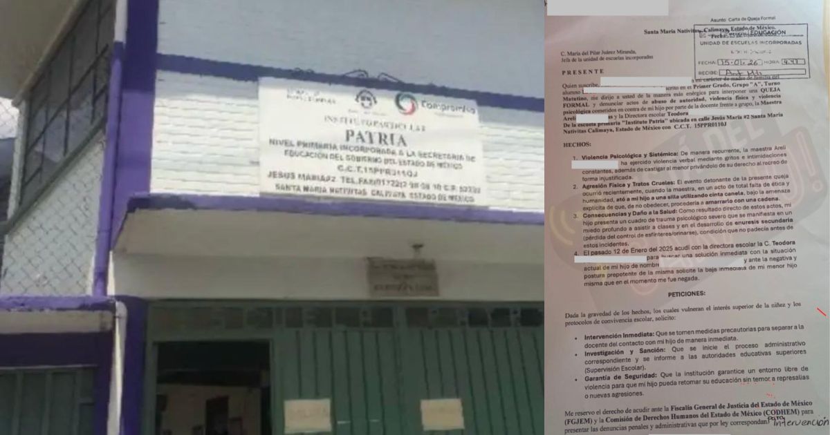 En el municipio de Calimaya, el miedo no debería habitar un salón de clases, pero en la primaria Instituto Patria se volvió rutina. Padres de familia denunciaron que una docente de primer grado, identificada como Areli “N”, en el Instituto Patria, habría presuntamente atado a un niño a su silla con cinta canela como forma de castigo, además de amenazarlo con utilizar una cadena si no obedecía. El hecho, ocurrido dentro del aula, detonó una ola de indignación y temor entre las familias.