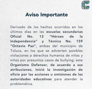 Inició la Comisión de Derechos Humanos del Edomex una investigación de oficio por presuntos casos reiterados de acoso escolar en dos secundarias de Toluca