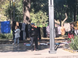 En el perímetro de la Torre Latinoamericana también persisten puestos ambulantes, incluidos algunos de carácter feminista, que continúan operando pese a la vigilancia constante. En calles como Moneda y Correo Mayor, los comerciantes mantienen comunicación entre ellos y con conductores de ciclotaxis, quienes alertan sobre la presencia de autoridades.