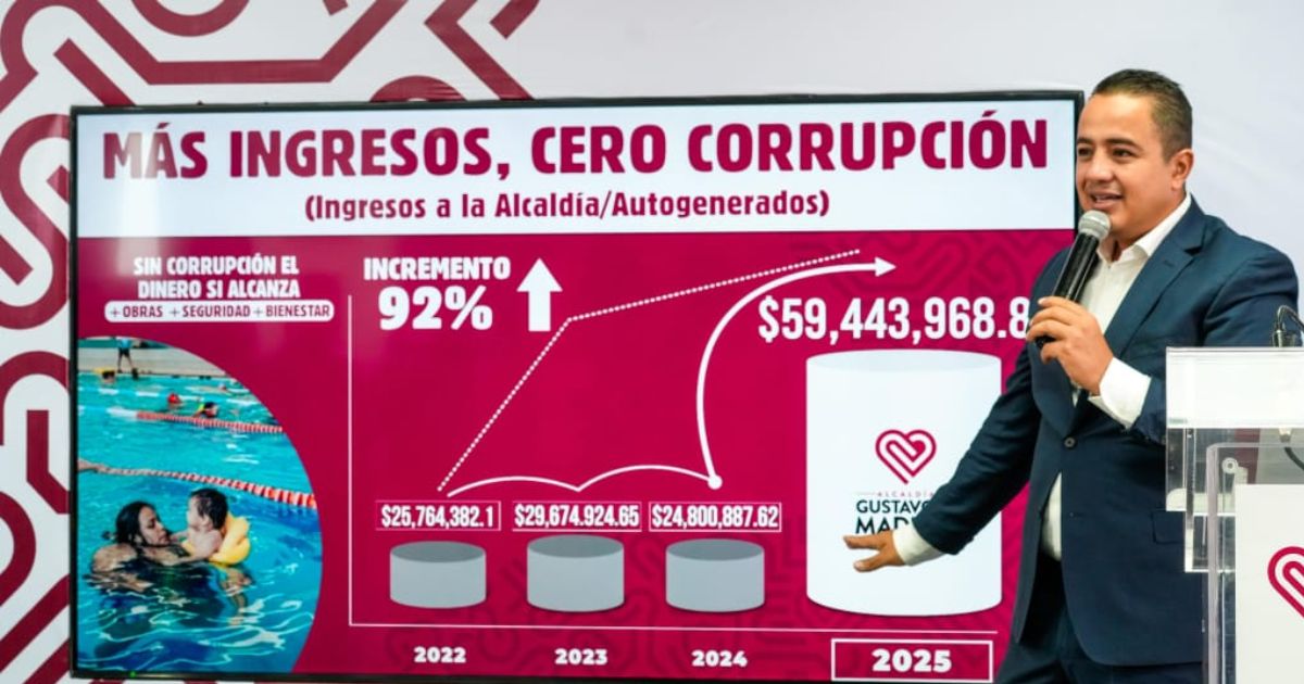En el mismo balance anual, el alcalde dio a conocer que Gustavo A. Madero se convirtió en 2025 en la alcaldía con mayor recaudación de recursos autogenerados en la Ciudad de México, al alcanzar un total de 59 millones 443 mil 968.81 pesos, lo que representa un incremento del 92 por ciento en comparación con administraciones anteriores.