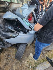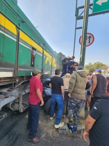 Arrastra tren un auto y conductor queda prensado entre los fierros retorcidos