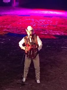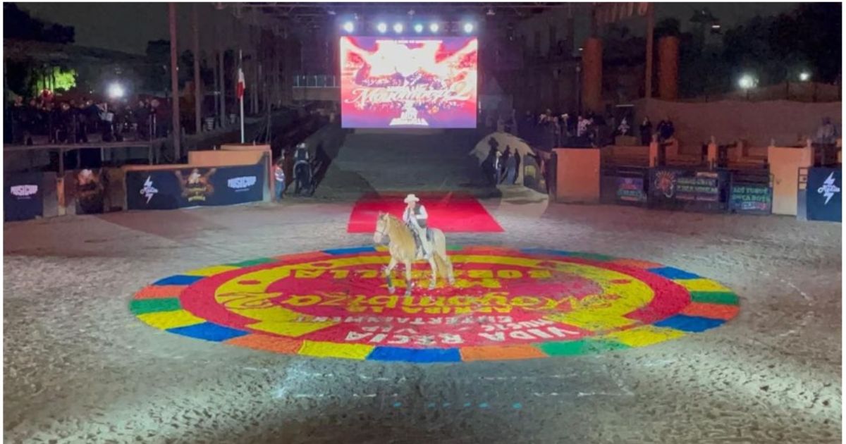 Moy Bobadilla apareció en el ruedo al filo de las 9:30 horas de la noche, montado en su caballo, acompañado de su enorme banda. “Gracias por estar aquí, viva México Cabro…”, dijo el cantante enfundado en traje texano y su sombrero a juego.